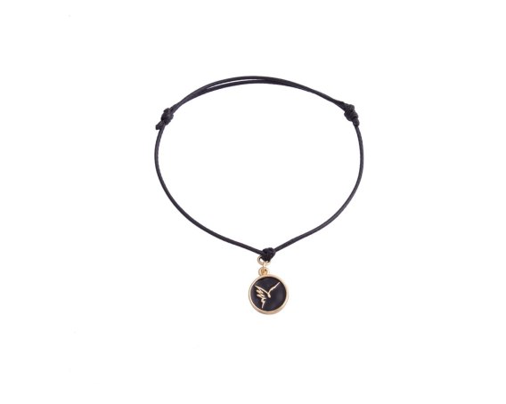 Bransoletka z logo Colibra na czarnym sznurku. Przyjazny dla skóry stop srebra i cyny, powłoka 24k złoto.