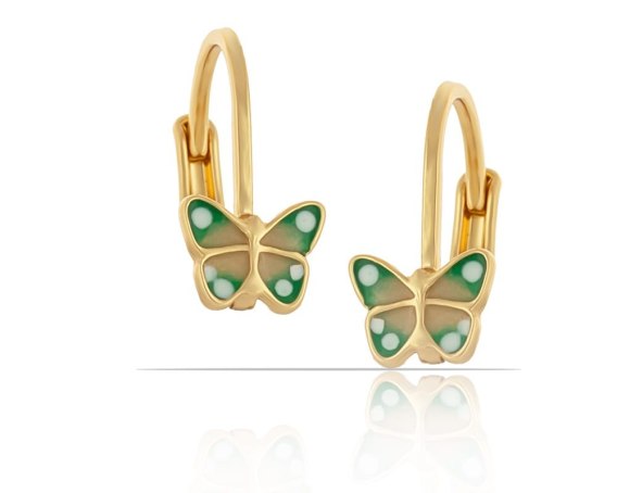 Przepiękne, pozłacane, ręcznie malowane na zielono - żółto kolczyki motylki na zapięciu angielskim dla małej księżniczki. Wymiary kolczyka 1,5 cm x 0,6 cm.
