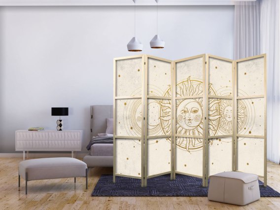 Parawan "Parawan - Złote Słońce i Księżyc - artystyczna ilustracja w stylu retro" to element wyposażenia dający wiele możliwości. Cechuje go m.in. praktyczność. Jego podstawowym zadaniem jest podzielenie przestrzeni na kilka stref w dyskretny i estetyczny sposób. Parawany pokojowe pozwalają na odseparowanie w ciekawy sposób części przeznaczonej do relaksu od tej wyznaczonej do pracy. Dlatego często znajdują one zastosowanie w salonie. Parawany pozwalają też na sprytne ukrycie czegoś, co nie powinno być w pełni widoczne, przykładowo stojaka z ubraniami czy też suszarki z praniem. Można wykorzystać je więc na różne sposoby, zależnie od własnych potrzeb i wymagań. Dostępne w naszej ofercie parawany pokojowe to flizelinowe płótno zamocowane na drewnianym stelażu. Wyróżniają się bardzo solidną konstrukcją, a do wyboru są dwa formaty: 3-częściowy oraz 5-częściowy. Poszczególne elementy są ze sobą połączone za pomocą metalowych, mocnych zawiasów. Złożenie i rozłożenie parawanu nie stanowi żadnego problemu.
