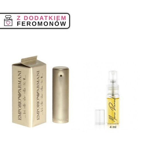 Perfumy nr 047 4ml z feromonami - zamiennik inspirowany Emporio Armani For Her 2008 od Giorgio ArmaniZamiennik perfum inspirowany Emporio Armani For Her 2008 od Giorgio ArmaniZamiennik inspirowany Emporio Armani For Her 2008 to zapach, który w subtelny sposób otula zmysły aksamitnym welurem. Jego ciepłe nuty wanilii i pudru tworzą zmysłową aurę, która przenosi do świata elegancji i wyrafinowania. Ta kompozycja idealnie sprawdzi się podczas romantycznych wieczorów i eleganckich spotkań, dodając pewności siebie i klasy. Dla osób, które pragną wyróżniać się w tłumie i cenią sobie wysoką jakość w przystępnej cenie, ten zapach będzie doskonałym wyborem.Charakter zapachu i główne akordyGłówne akordy: waniliowy, pudrowy, kwiatowy, piżmowy, drzewnyTa kompozycja emanuje delikatnością, a jednocześnie intensywnością, która zachwyca. Ciepłe akordy wanilii harmonizują z pudrowymi nutami, tworząc niezapomniane wrażenie, które pozostaje w pamięci na długo.Nuty zapachoweKompozycja zapachu opiera się na klasycznej piramidzie zapachowej, która rozwija się od świeżych nut głowy, przez zmysłowe serce, aż po głęboką bazę.Nuty zapachowe głowymandarynkabergamotkagruszkaananasNuty zapachowe sercaheliotropfiołekirysjaśminNuty zapachowe bazywaniliapiżmocedrTa kompozycja to doskonałe połączenie elegancji i dostępności, które zadowoli każdego, kto ceni sobie wyrafinowane doznania zapachowe.Zapach inspirowany Giorgio Armani Emporio Armani For Her 2008, nie jest jednak jej produktem ani oryginałem. To niezależna kompozycja zapachowa oparta na wysokiej jakości półproduktach, mieszanych przez nas, w Polsce.Wybierz swój zapach - ListaPerfumy w Biznesie, jak i wszystkie inne zapachy dla kobiet spowodują, że poczujesz się magicznie i wyjątkowo, a zarazem dodadzą Ci otoczki tajemniczości i kobiecości. W ofercie zapachów damskich proponujemy zakup perfum o unikalnym, trwałym i wyjątkowym zapachu, ponieważ ich zaperfumowanie, to 24% olejków eterycznych.Perfum z Twoim firmowym logo w kulku wariantach:PRODUKT HANDLOWY - zarabiaj na sprzedaży perfum stworzonych z perfekcyjnie dobranych składników. Naklej logo swojej marki na butelce i kartoniku.PRODUKT MARKETINGOWY - rozszerz swój target marketingowy poprzez dodanie nowego rodzaju produktu. Zdobądź nowych klientów poprzez zmysł zapachu.UPOMINEK - dzięki zapachowi, Twoja marka będzie w stanie łączyć się z konsumentami na głębszym poziomie emocjonalnym.ZESTAW PROMOCYJNY - Pachnący dodatek do Twoich produktów zapewni klientowi pozytywne wrażenia na wielu zmysłowych poziomach.Wszystko ma swój indywidualny zapach. Teraz możemy go zmienić, stwarzając własną unikatową kompozycję, która odtąd będzie wizytówką, marką, bądź zapachem marketingowym, promocyjnym, upominkowym, a także każdym innym, który pomoże osiągnąć sukces.Zajmujemy się wszystkim od A do Z. Oznacza to w pełni kompleksową usługę. Życzymy wszystkim udanych wyborów i zadowolenia.