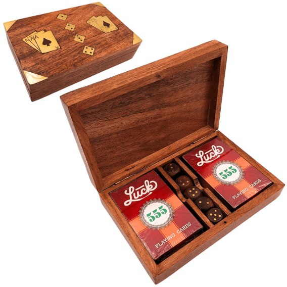 ?Zestaw zawiera: Dwie talie kart do gry, kości do gry, eleganckie drewniane pudełko